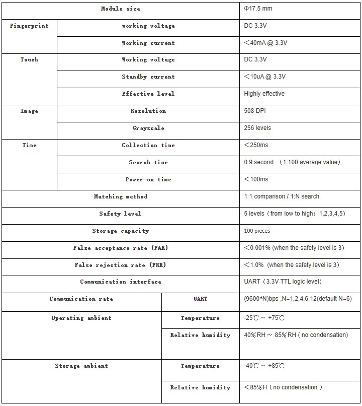 When enrolling, user needs to enter the finger two times. The system will process the two-time finger images, generate a template of the finger based on processing results and store the template. When matching, user enters the finger through optical sensor and system will generate a template of the finger and compare it with templates of the finger library. For 1:1 matching, system will compare the live finger with specifc template designated in the Module; for 1:N matching, or searching, system will search the whole finger library for the matching finger. In both circumstances, system will return the matching result, success or failure.AR-6KM series are separate fingerprint identification modules. The module performs series of functions like fingerprint enrollment, image processing, fingerprint matching, searching and template storage.