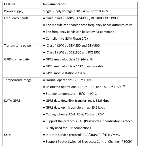 The ADH8011 is a Quad-band GSM/GPRS engine that works at frequencies GSM 850MHz, GSM 900MHz, DCS 1800MHz and PCS1900MHz. The ADH8011 features GPRS multi-slot class 12 and supports the GPRS coding schemes CS-1, CS-2, CS-3 and CS-4.